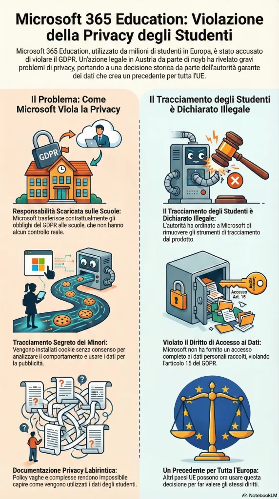 L’organizzazione noyb ha presentato diverse denunce contro Microsoft 365 Education, accusando l’azienda di violare la privacy degli studenti attraverso un sistema di tracciamento illecito e poco trasparente. Le fonti evidenziano come la multinazionale tenti di scaricare la responsabilità legale sulle scuole, le quali però non hanno il controllo effettivo sui dati né la capacità di rispondere alle richieste di accesso degli utenti. L’autorità garante austriaca (DSB) ha recentemente stabilito che tale monitoraggio tramite cookie è illegale, ordinando a Microsoft di interrompere queste pratiche e di eliminare le informazioni raccolte senza consenso. La decisione sottolinea una grave mancanza di chiarezza nella documentazione contrattuale, che rende quasi impossibile per insegnanti e genitori comprendere come vengano realmente utilizzati i dati dei minori. Questo verdetto rappresenta un precedente significativo per tutta l’Unione Europea, mettendo in discussione la conformità al GDPR dei prodotti software utilizzati da milioni di studenti.